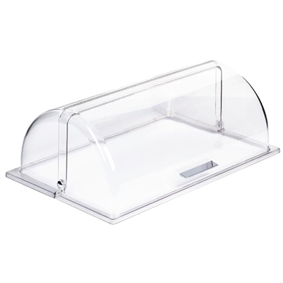 This plastic 1/1 gastronorm rolltop cover fits perfectly ontop of the stainless steel platters, sold separately, keeping the food items covered but still visible to customers, and fresher for longer.