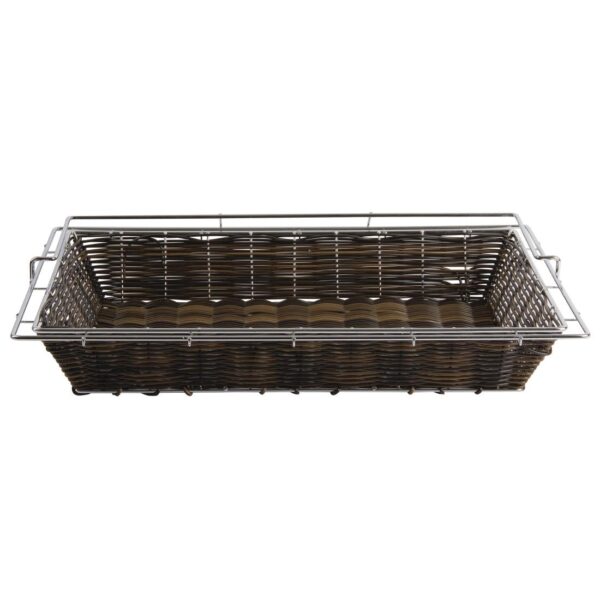 This dark brown 1/1 gastronorm sized polyrattan basket is the perfect accompaniment to your buffet system for appropriately displaying breakfast items such as pastries and breads, but this basket has an added touch, it has a frame, which enables you to be able to use a roll top cover with it; GC910, sold separately, keeping your food items on show as well as fresh and covered.
