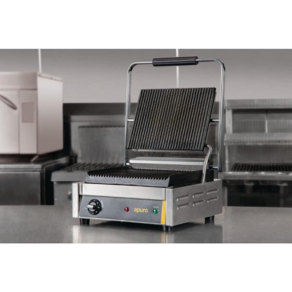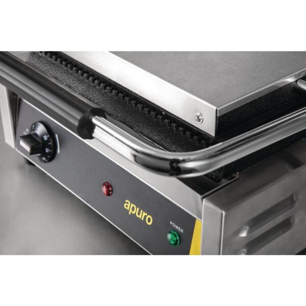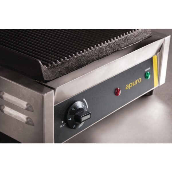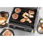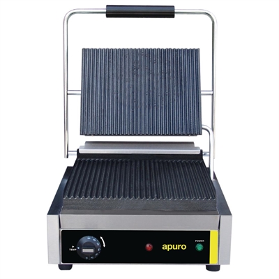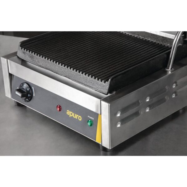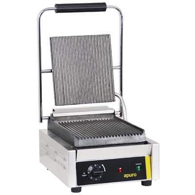 The robust Apuro bistro contact grill combines a tough stainless steel construction with ribbed cast iron plates for long-term use and exceptional grilling results – ideal for cooking burgers, steaks, panini and toasted sandwiches.