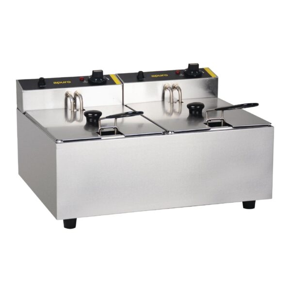 The powerful Apuro countertop double Deep Fryer with stainless steel lids features separate tanks to prevent cross contamination, as well as to increase output and allow a wider variety of foods to be cooked at the same time.