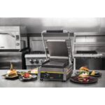 The robust Apuro bistro contact grill combines a tough stainless steel construction with ribbed cast iron plates for long-term use and exceptional grilling results – ideal for cooking burgers, steaks, panini and toasted sandwiches.