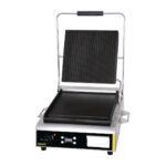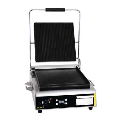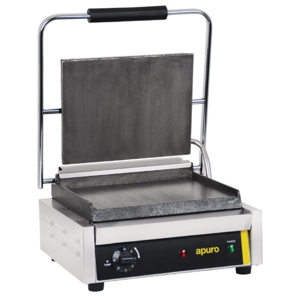 A great value contact grill from Apuro, combining tough stainless steel construction with flat cast iron plates for long-term use.