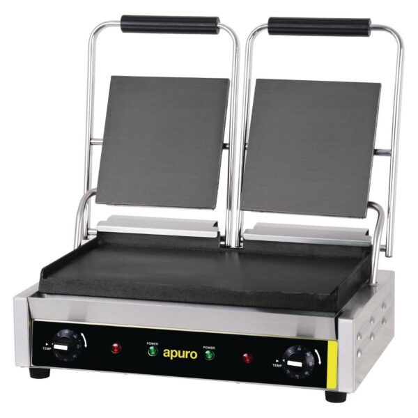 A great value contact grill from Apuro, combining tough stainless steel construction with flat cast iron plates for long-term use.