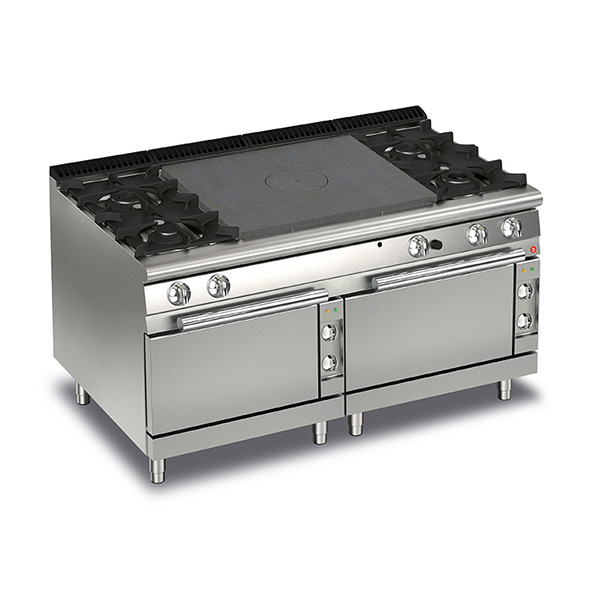 - Gas target top with two gas burners on the left and right and two electric ovens.