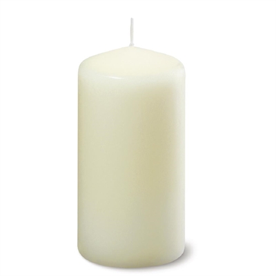- A box of six tall ivory pillar candles, with an approximate burn time of thirty nine hours and a low smoke output.