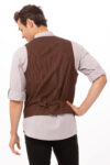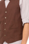 This button front vest features two front welt pockets, front darts, and a back tie with an adjustable slider.