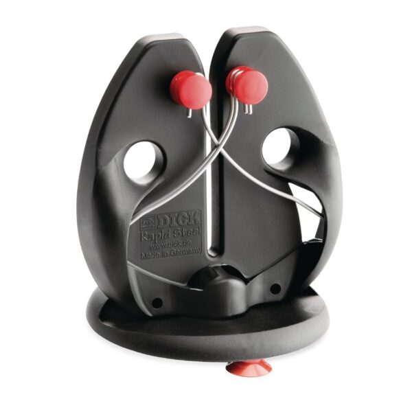 - The suction base keeps the stand in place on your benchtop, while the two finger holes let you hold the sharpener steady if you dont use the stand.
