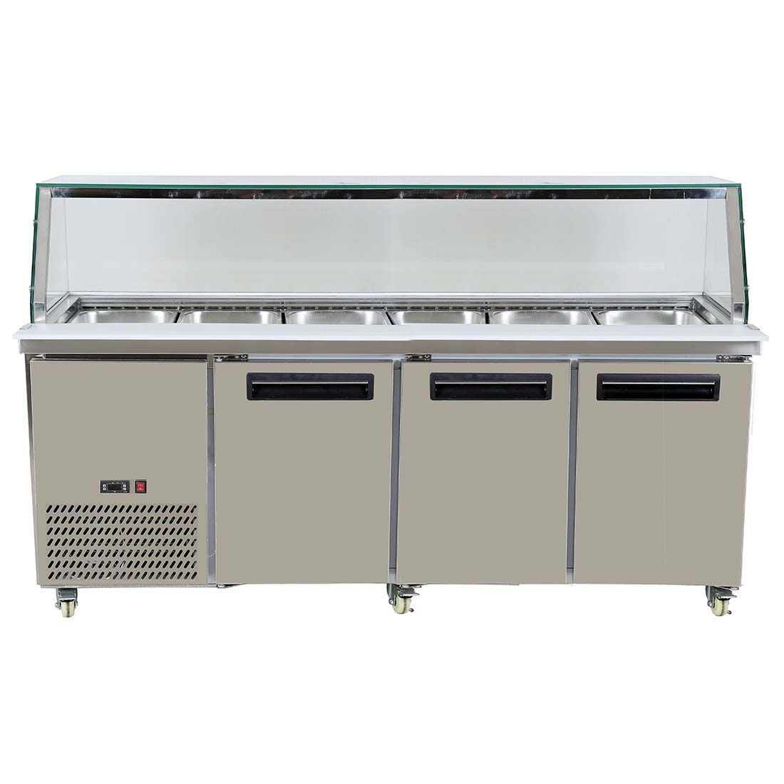 The unit has Frameless glass display area at the front and rear twin sliding doors to allow access from either side, rear PE cutting board is included and the large refrigerated rear storage keeps fresh stock on-hand during busy periods.