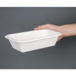 • Made from a strong, sturdy bagasse material thats resistant to grease and holds its shape even when piled high with food.