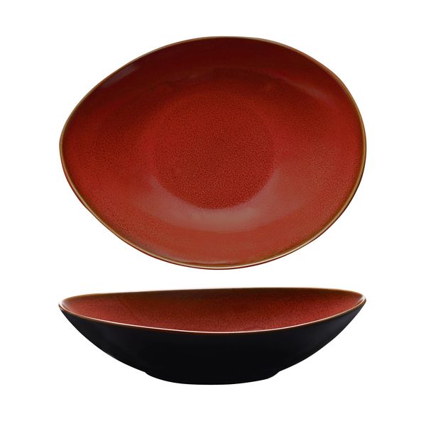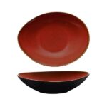- The reactive glaze combined with the rich Crimson colour creates an eye catching base to serve on. The black, red gradient rim assists your vision to make it a star.
