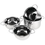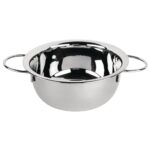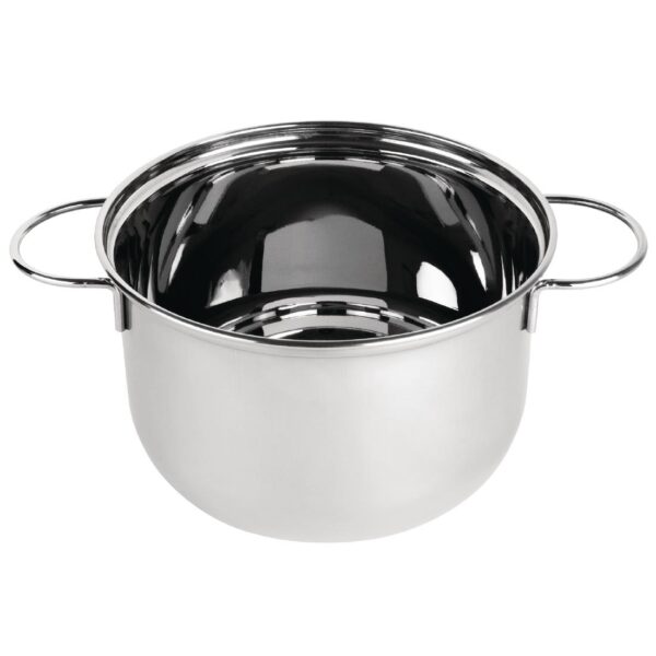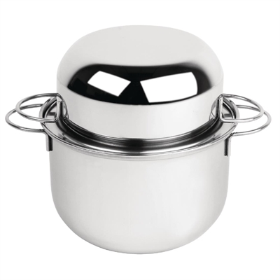 This mussel pot is made from solid stainless steel and allows you to serve steamed mussels straight to the table.