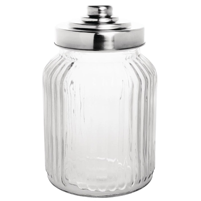 This jar is an ideal container for storing confectionary or preserves and the ribbed vintage-style ribbed glass looks great on any kitchen or bar shelf.