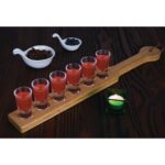 - Carry shot glasses or dessert tasters safely and easily using this 500(W) x 60(D)mm Olympia six shot wooden paddle board.
