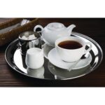 Carry teas, coffees and other hot or cold drinks safely and efficiently with this high quality 355mm stainless steel serving tray from Olympia.