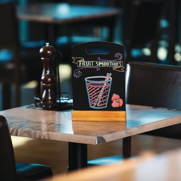 - Combining a cutaway handle, arched top and sturdy pine base, this melamine chalkboard is an effective way of marketing to your customers at their table or displaying offers and important information at the bar.