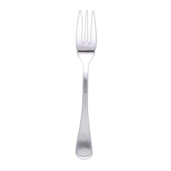 This dessert fork features an hourglass shaped handle with a satin finish that blends to a highly polished utensil end.
