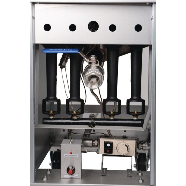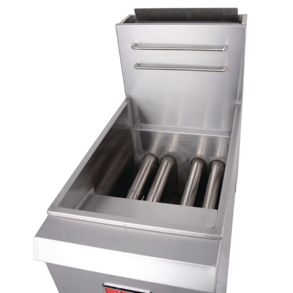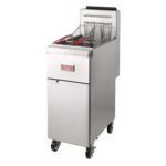 A heavy duty, free-standing natural gas Deep Fryer from Thor, featuring flame failure protection, a built-in flue detector, hardwearing castor wheels and a thermostat valve.