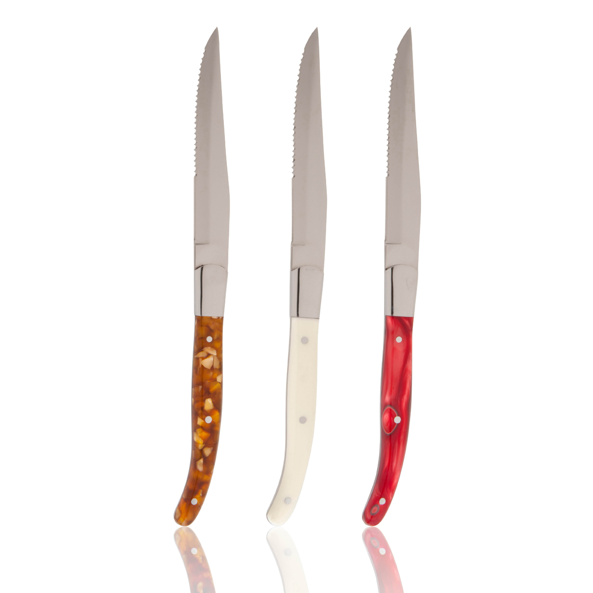 - Its slightly curved handle and thin serrated blade evoke a refined, but classy styling. Provencal steak knives are available with five different coloured handles.