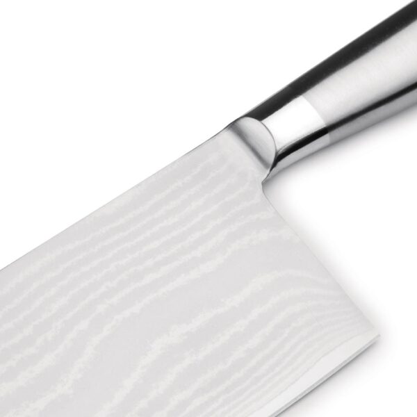 The wide blade carries chopped food from the cutting board to your pan and the inner layer is coated by two layers of Damascus steel, protecting it against corrosion.