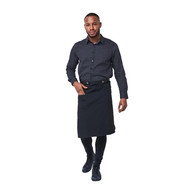 A black PU leather studded strap around the waist gives this apron a more modern and fresh look that will complement any professional hospitality uniform, particularly for wine room, cocktail or bar staff.