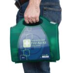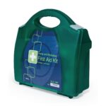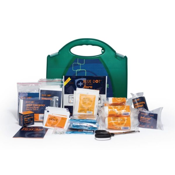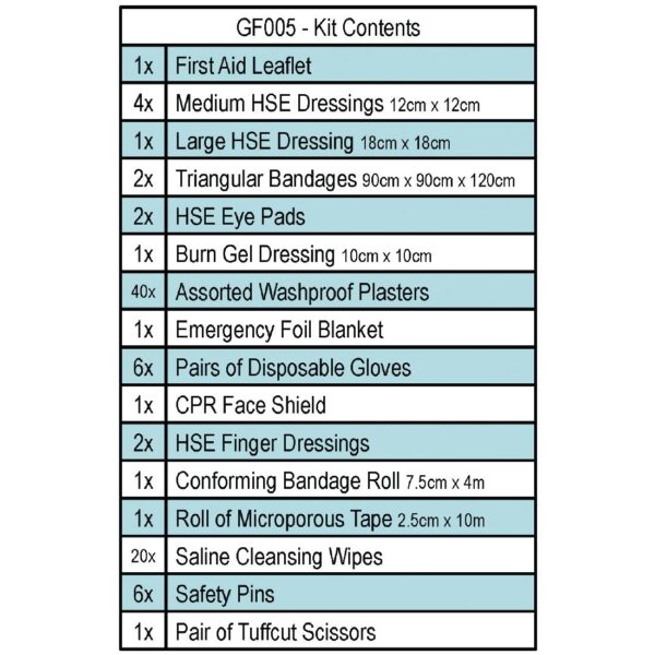 Suitable for up to 10 people in a low risk work environment, this small kit includes: A5 First Aid Leaflet , 4x Medium HSE Dressing 12x12cm, Large HSE Dressing 18x18cm, 2x Triangle Bandage 90x90x120cm, 2x HSE Eyepad, Sterile Gel Dressing 10x10cm, 40x Assorted Plasters, Emergency Foil Blanket, 6x Disposable Gloves (Pair), CPR Face Shield, 2x HSE Finger Dressing, Bandage 7.5cm x4m, Micropore 2.5cm x 10m, 20x Sterile Wipes, Safety Pins, Tuffcut Scissors 7.5 x 190mm.