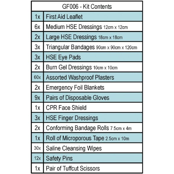 - Suitable for up to 10 people, this medium sized kit includes: A5 First Aid Leaflet, 6x Medium HSE Dressing 12x12cm, 2x Large HSE Dressing 18x18cm, 3x Triangle Bandage 90x90x120cm, 3x HSE Eyepad, 2x Sterile Gel Dressing 10x10cm, 6x Assorted Plasters, 2x Emergency Foil Blanket, 9x Disposable Gloves (Pair), CPR Face Shield, 3x HSE Finger Dressing, 2x Bandage 7.5cm x4m, Micropore 2.5cm x 10m, 30x Sterile Wipes, Safety Pins, Tuffcut Scissors 7.5 x 190mm.