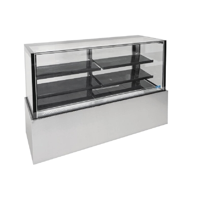 This four-sided glass display, which features removable rear sliding double glazed doors, is suitable for displaying cakes and desserts, as well as a variety of other foods, such as meats and cheeses.