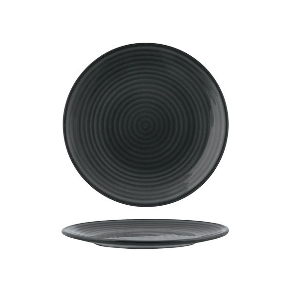 Create stunning contrast at the tabletop with this Charcoal coupe plate from Zuma; use against a white cloth for a striking appearance or use against a dark wood surface for a natural look.